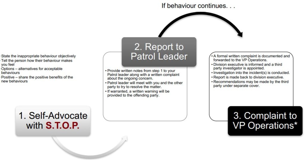 2. If the behaviour continues or you feel uncomfortable addressing the individual directly, discuss the issue with your Patrol Leader (PL).