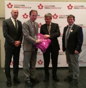 (l-r) Then President and CEO Colin Saravanamuttoo, Robert Birkett, representing the Insurance Brokers Association of Canada (IBAC), Patrice Pouliot, Director Jeffrey Reath (photo provided by Mark Brown)