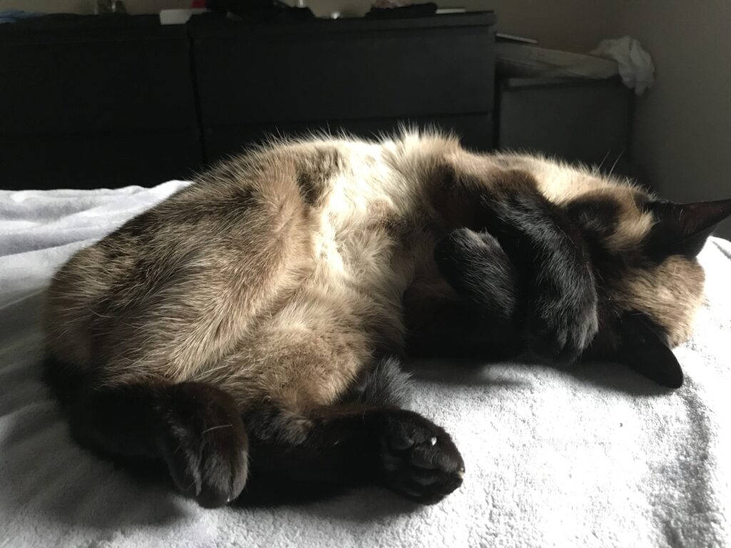 Bodhi is a 12-year-old Siamese cat rescued from the streets of Hamilton. He may be handsome, but don’t mistake that for him being sweet. He’s a cremlin – a cat gremlin – and he will take a chunk out of you if you look at him the wrong way! Despite his temper, he complies when he’s told “We don’t bite family members.” You can take the cat out of the streets, but when it comes to Bodhi, you can’t take the streets out of the cat.