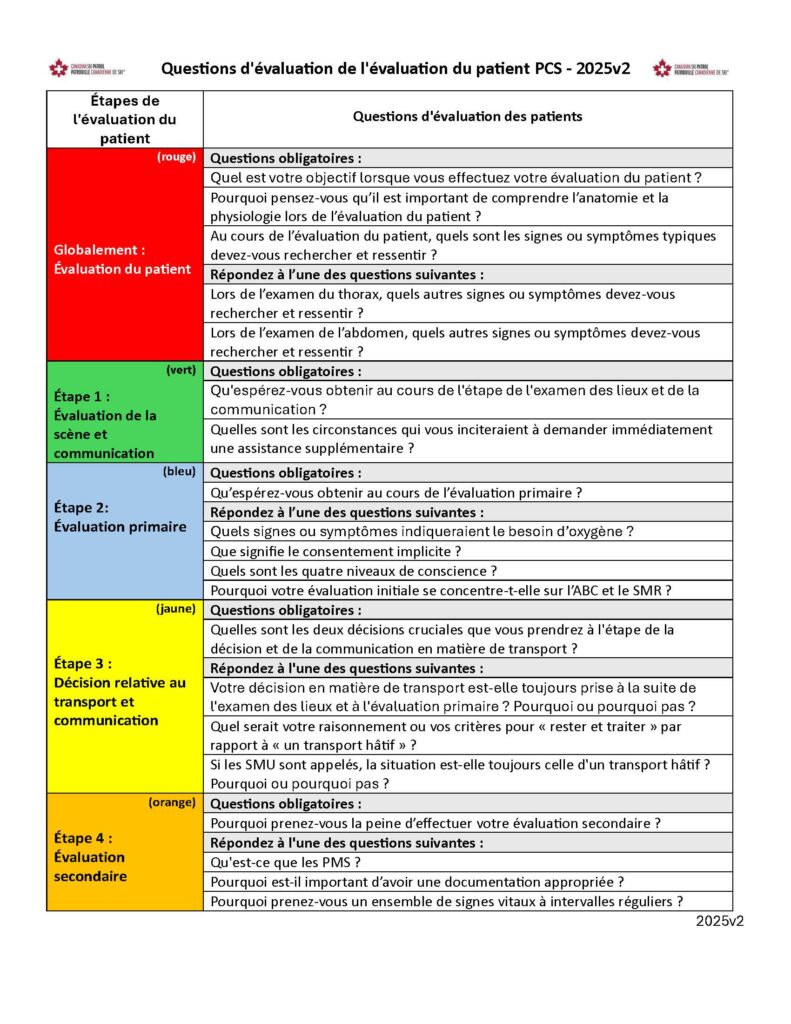 L’évaluation de l’Évaluation du patient fait partie du dossier annuel des compétences de chaque membre de la PCS. Chacun d’entre nous doit démontrer et verbaliser une Évaluation du patient. L’évaluation a toujours comporté des questions sur le contenu à la fin de l’Évaluation du patient. Ces questions sont désormais remplacées par des questions de base qui explorent votre compréhension. Selon votre choix, les questions peuvent être posées avant, pendant ou après votre démonstration. Vous répondez brièvement aux questions avec vos propres mots pour démontrer votre compréhension. Il ne s’agit pas d’un travail qui s’appuie sur la mémoire.